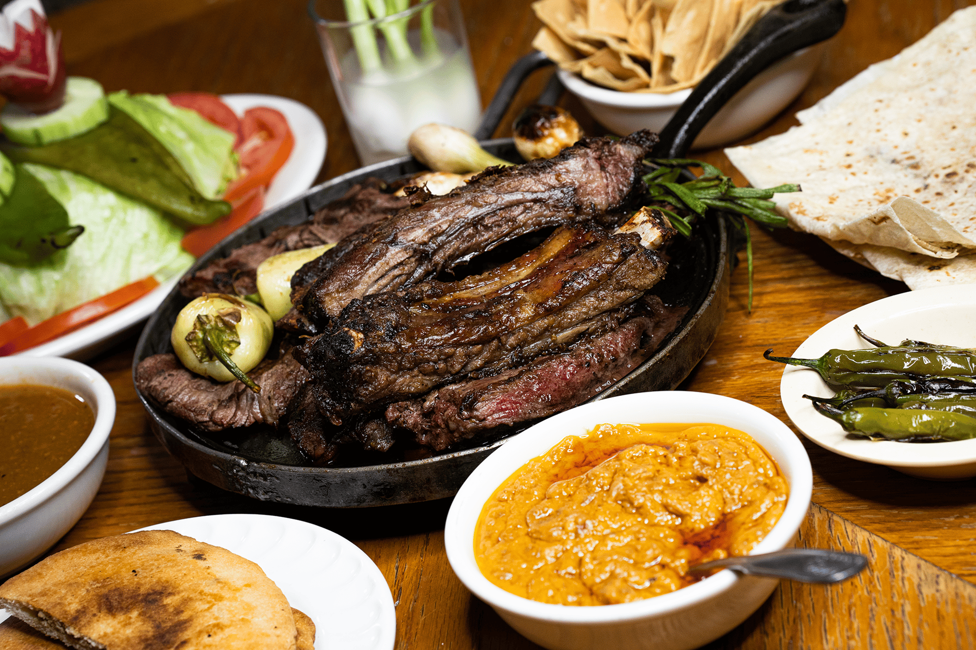 ENSALADA DE VERDURAS, PAPA AL HORNO, FRIJOLES MANEADOS, TORTILLAS DE HARINA, SALSA PICANTE, CEBOLLITAS EN LIMÓN Y COYOTAS.